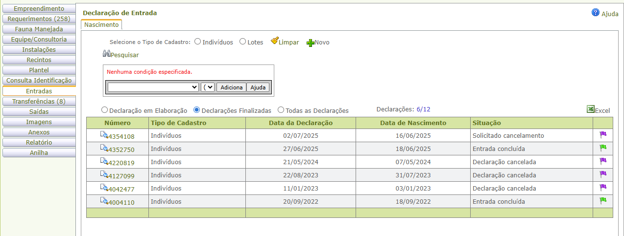 - Os indivíduos declarados serão inseridos automaticamente no plantel do empreendimento e podem ser consultados a partir da aba "Plantel > Indivíduos".