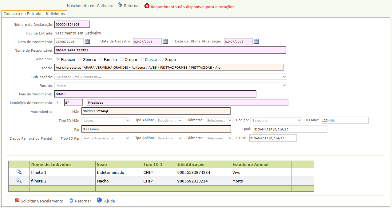 - Na declaração gerada, preencha data de nascimento do(s) indivíduo(s) nascido(s), espécie, recinto e ascendentes (pai e mãe). Informar os ascendentes pode ser obrigatório a depender da espécie informada.