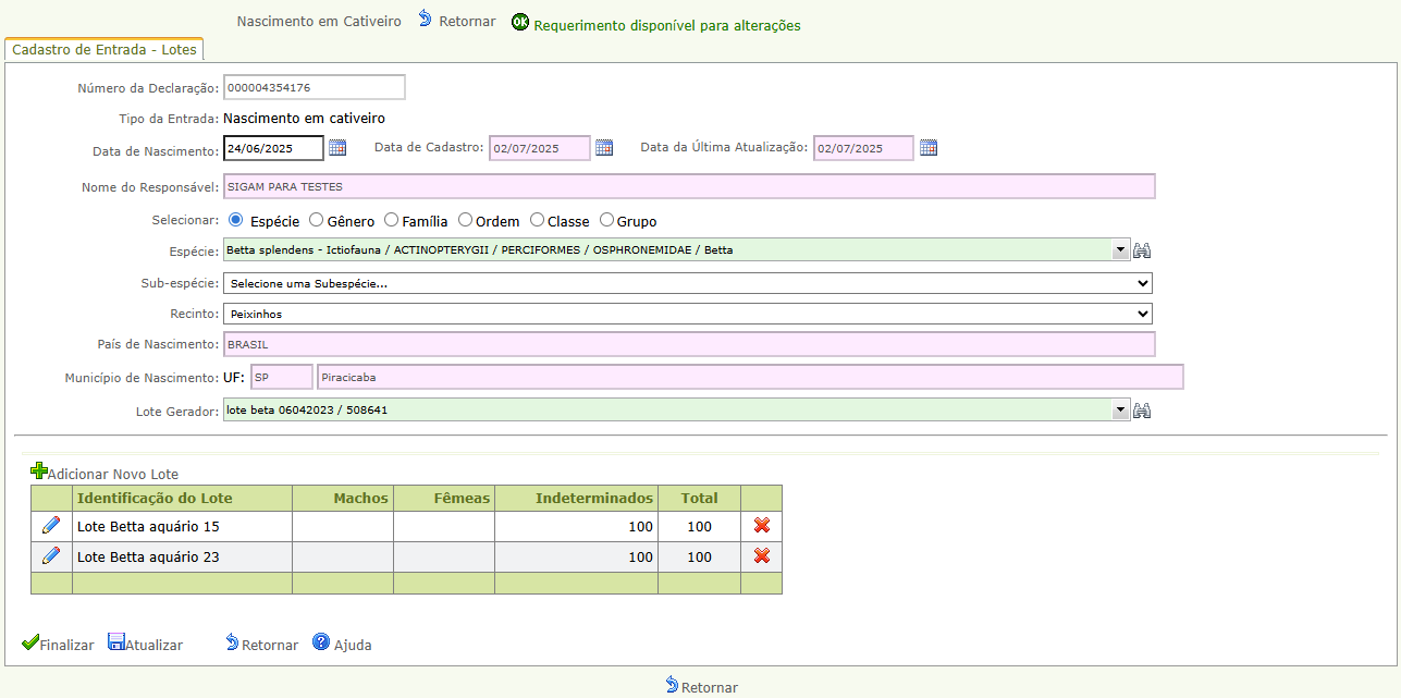 Nota: Declarações feitas após o prazo (dias entre nascimento e declaração no sistema): a finalização da declaração estará sujeita a análise pelo órgão. Nesse caso, os filhotes só serão inseridos no plantel do empreendimento após confirmação pelo órgão.
