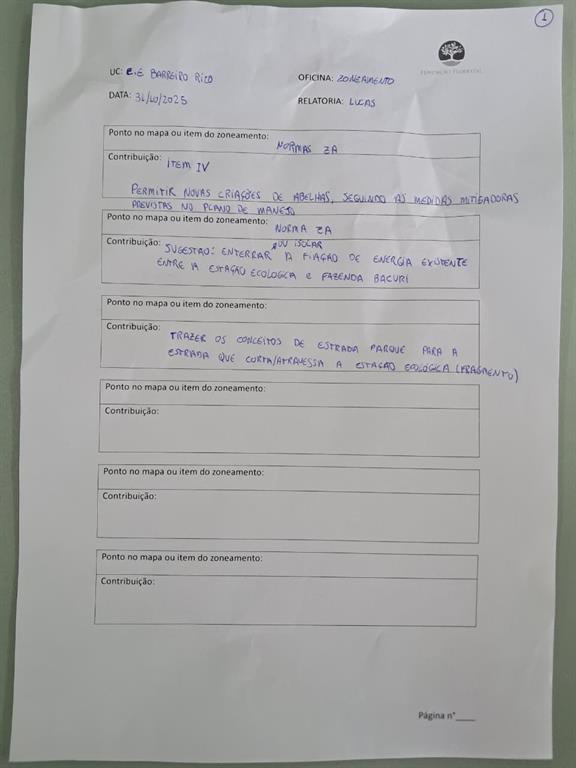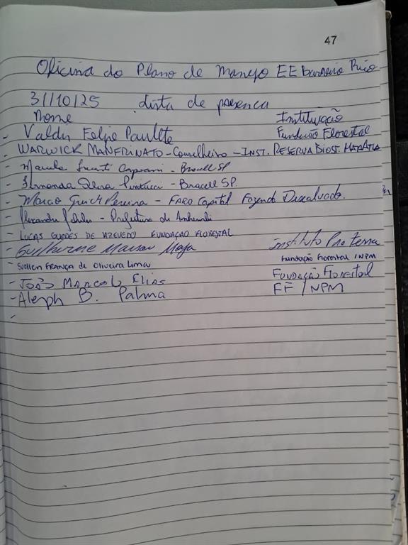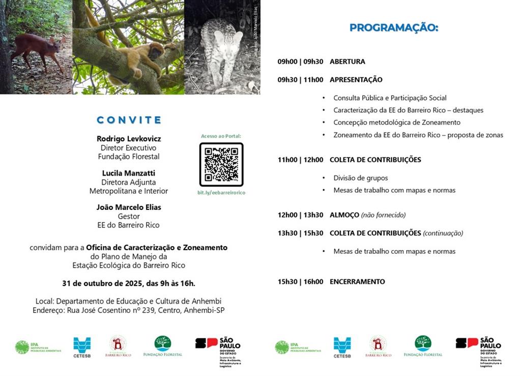 DIA 03 DE MAIO DE 2022 Oficina de Zoneamento da EE Barreiro Rico A reunião teve início às 09h com mensagens de boas-vindas por parte do gestor da EE Barreiro Rico, João Marcelo. A oficina contou com a presença de 13 participantes, entre integrantes do Núcleo Planos de manejo da FF, Conselheiros das UCs e convidados. Após uma rodada de apresentações dos participantes e das instituições que representam, o objetivo da oficina e a pauta do dia foram apresentados e os trabalhos foram iniciados. Adriana Bueno (NPM/FF) fez uma breve apresentação sobre os momentos e canais destinados à consulta pública e coleta de contribuições durante a elaboração dos Planos de Manejo: relembrou as reuniões e oficinas já ocorridas desde de dezembro de 2020 até junho 2021, ou seja, as reuniões de formação, planejamento e oficina de caracterização, ocorridas em conjunto com a APA Barreiro Rico; no intervalo entre a última oficina de caracterização e o momento atual foi elaborado o plano de manejo da APA Barreiro Rico; apresentou os próximos encontros, sendo a oficina de zoneamento, programas de gestão e reunião de devolutivas e manifestação do Conselhos; explicou que, além desses encontros, é possível participar por meio do portal eletrônico e reuniões setoriais – estas devem ser solicitadas pelos grupos interessados e podem ocorrem a qualquer momento. Informou que as coletas serão recepcionadas até dia 21 de junho. Adriana salientou os momentos e instâncias com poder de alteração do produto em elaboração: comitê de integração dos planos de manejo, Câmara Temática de Biodiversidade (CTBio), plenária do Consema, além de o próprio Secretário de infraestrutura e Meio Ambiente no momento da assinatura da Resolução pelo que aprova o plano de manejo. Ainda foi apresentado o portal eletrônico do Plano de Manejo da EE Barreiro Rico e a avaliação da oficina de caracterização.  A segunda apresentação foi sobre o que zoneamento e a concepção de zoneamento da categoria Estação Ecológica segundo o roteiro metodológico do Estado de São Paulo. Foi explicado que o zoneamento é a delimitação de porções do território com objetivos e normas específicas para auxiliar a UC no alcance de seus objetivos, sendo composto por zoneamento interno e zona de amortecimento. Segundo o roteiro metodológico, o zoneamento interno é composto por zonas (grandes porções do território) e áreas (porções menores e sobrepostas às zonas) e a zona de amortecimento; as zonas são passíveis de alteração apenas com a revisão do plano de manejo (caráter permanente) e as áreas podem ser alteradas por rito simplificado a qualquer momento (caráter flexível). A Estação Ecológica pode possuir 4 zonas e 4 áreas, além da zona de amortecimento. Foram apresentadas ainda a definição e objetivos de cada Zona (Preservação, Conservação, Recuperação e Uso Extensivo) e Área (Uso Público, Administração, Histórico Cultural e Interferência Experimental).  João Marcelo apresentou a proposta de zoneamento interno e zona de amortecimento para a Estação Ecológica do Barreiro Rico. Foi apresentado o mapa de vegetação com as áreas mais conservadas e as áreas que necessitam de ações de recuperação, que foram os principais critérios para estabelecimento das zonas de conservação e recuperação, respectivamente. O zoneamento interno compreendeu ainda a Zona de Uso Extensivo e as áreas de uso público (Trilhas do Macaco, Cerrado e Nova) e áreas de administração para abrigar a futura infraestrutura de gestão. Os critérios para inclusão na zona de amortecimento foram: áreas com presença de primatas protegidos pela UC, Zona de Proteção dos Atributos do APA Barreiro Rico, Reservas legais, Áreas de Preservação Permanente (APP) e vegetação excedente e os vetores de pressão como perda de habitat, média a baixa conectividade entre os fragmentos, presença de estrada, efeito de borda, fogo, vegetação degradada e a consequente diminuição da população de muriquis. Após a apresentação do zoneamento pelo gestor (documento pode ser acessado ao lado), as propostas de zoneamento e as normas foram apresentadas em um painel dinâmico. Adriana fez a leitura das normas e as contribuições foram registradas. Entre as contribuições citamos: Guilherme Moya (Instituto Pró Terra Vida) sugeriu avaliar a disponibilidade dos proprietários das APPs que necessitam de recuperação para cadastrarem suas áreas no projeto nascentes. Para a zona de amortecimento foi proposta a proibição de cultivo de transgênicos e inclusão de áreas prioritárias de restauração indicadas no projeto Guarani para o município de Anhembi (a serem indicadas posteriormente). Para o zoneamento interno, foi sugerido o detalhamento da normativa sobre soltura de animais na UC. DIA 31 DE NOVEMBRO DE 2025 A reunião teve início às 09h com mensagens de boas-vindas por parte do gestor da EE Barreiro Rico, João Marcelo. A oficina contou com a presença de 11 participantes, entre integrantes do Núcleo Planos de manejo da FF, Conselheiros das UCs e convidados. Após uma rodada de apresentações dos participantes e das instituições que representam, o objetivo da oficina e a pauta do dia foram apresentados e os trabalhos foram iniciados. Aleph Palma (NPM/FF) destacou que o momento é de retomada das discussões do Plano de Manejo que já teve início, em razão de uma Ação Civil Pública. Fez uma breve apresentação sobre os momentos e canais destinados à consulta pública e coleta de contribuições durante a elaboração dos Planos de Manejo: relembrou as reuniões e oficinas já ocorridas desde de dezembro de 2020 até 2025, ou seja, as reuniões de formação, planejamento, oficina de caracterização, e oficina de zoneamento e setorial de zoneamento, sendo que algumas ocorreram junto com a APA Barreiro Rico; apresentou tambérm os próximos encontros, sendo a oficina de 