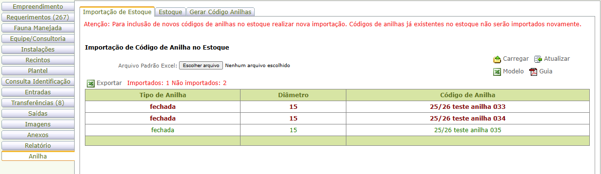- As anilhas importadas serão exibidas no estoque disponível do empreendimento.