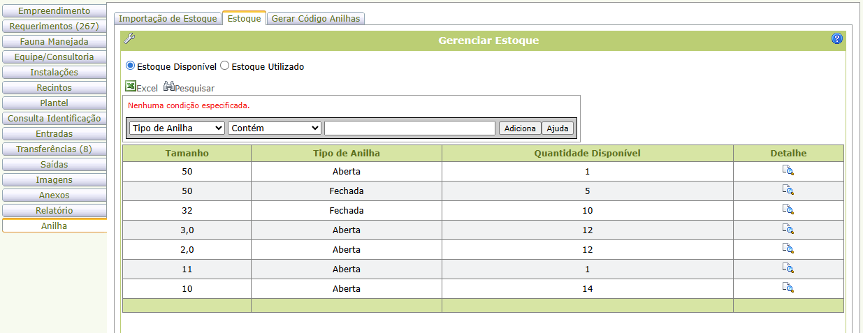 Consulte anilhas importadas ou geradas, disponíveis ou já utilizadas, a partir da aba Estoque.