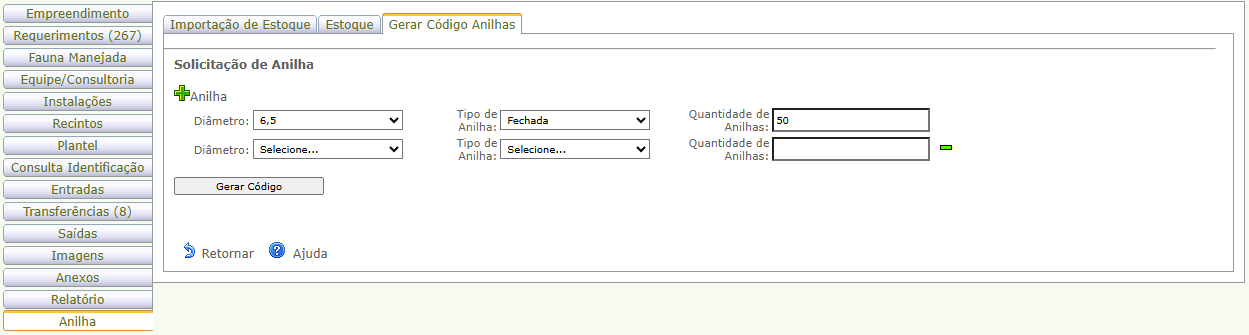 - Empreendimento é do tipo que não possui aba anilha: a aba anilha está disponível apenas para os tipos centro de triagem e reabilitação, criadouro comercial, criadouro científico, criadouro conservacionista e jardim zoológico.
