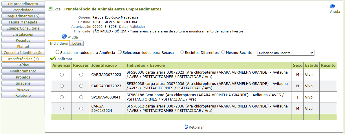 Confirme se recebeu ou não os indivíduos e lotes relacionados na transferência.