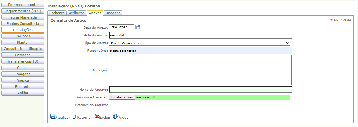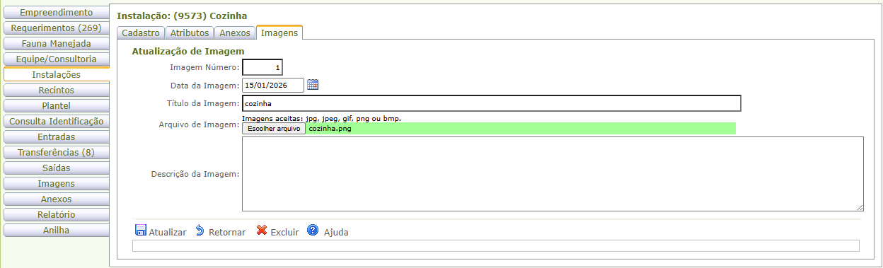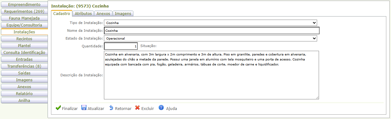 " para acessar a instalação cadastrada. Preencha ou edite as abas de cadastro. Atualize para salvar as alterações.