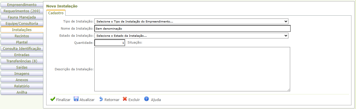 Tela de cadastro de instalações