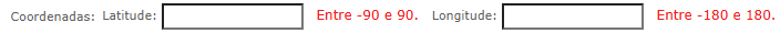 Descrição: Ao "colar" as coordenadas no campo latitude ou longitude, as informações são apagadas e um alerta vermelho é mostrado ao lado do campo.