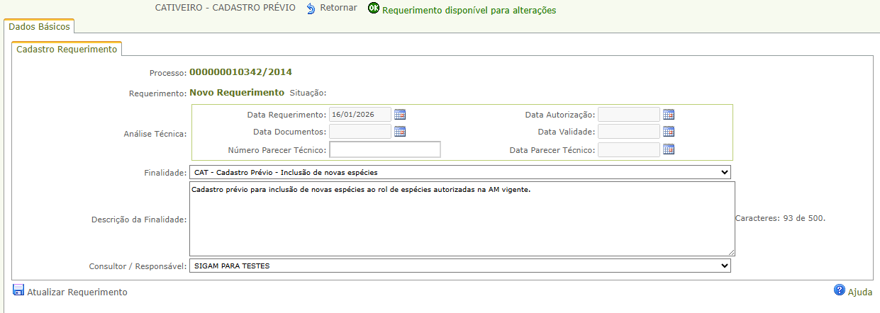 - Após preencher o requerimento, retorne à aba Dados Básicos.
