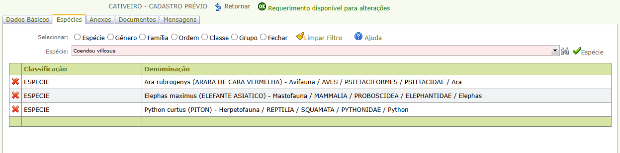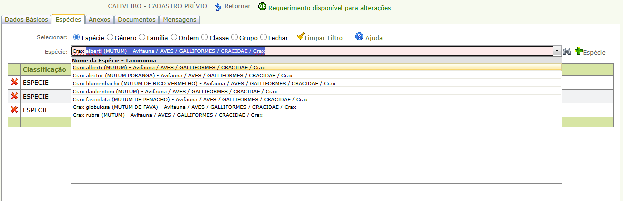 - Obs. Empreendimento do tipo Centro de Triagem e Reabilitação de Animais Silvestres - Cetras pode selecionar e adicionar qualquer nível taxonômico entre classe e espécie.