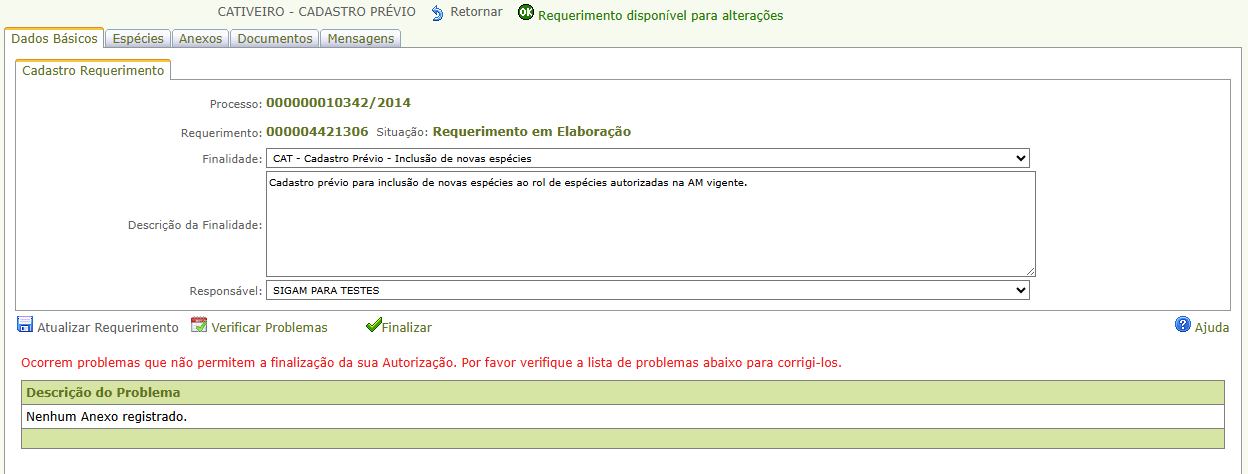 - Retorne às abas relacionadas e proceda com as correções necessárias. Após correções, retorne à aba “dados básicos” e clique em “requerer análise” para prosseguir.
