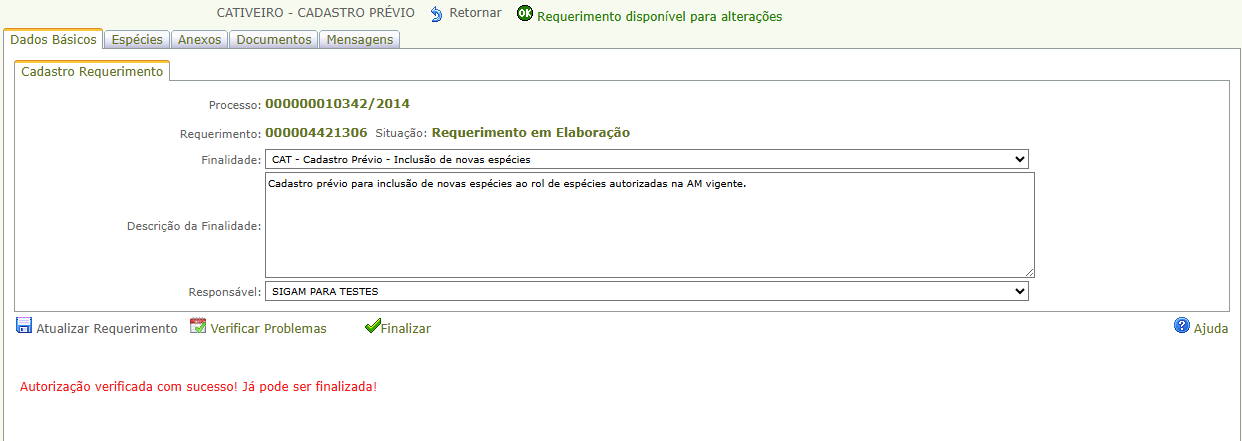 Acesse a aba Espécies e adicione espécies ao requerimento. |