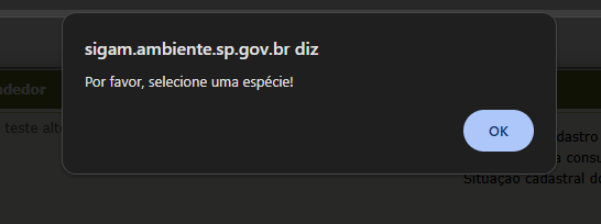Descrição: Ao clicar em “ Espécie” a mensagem “Por favor, selecione uma espécie!” é mostrada.