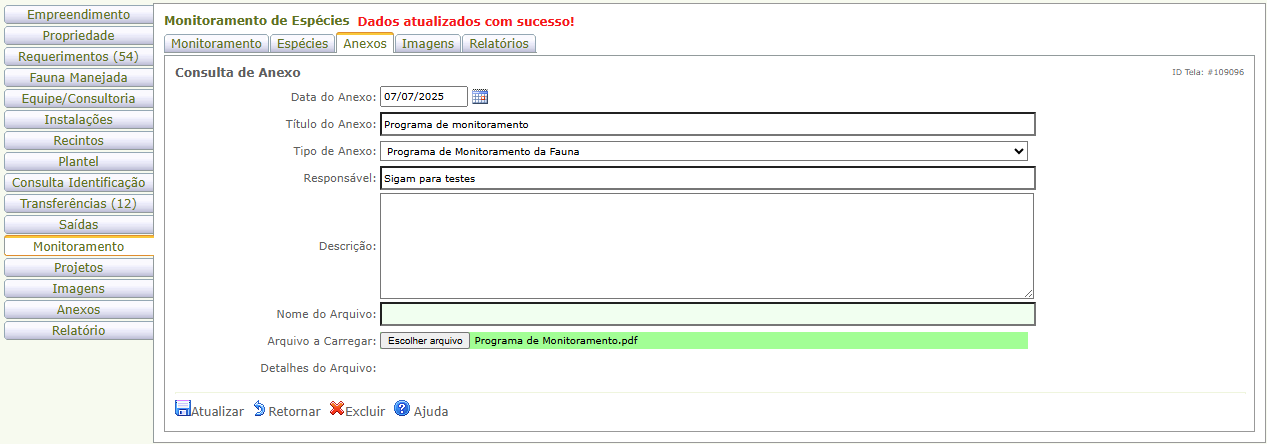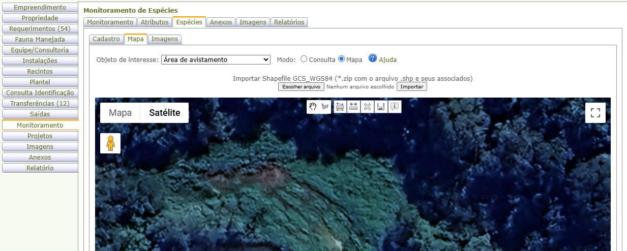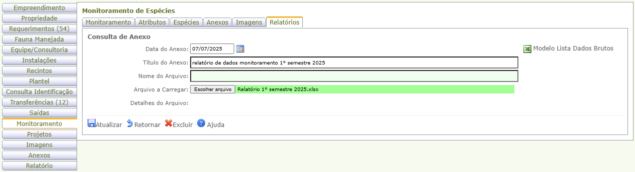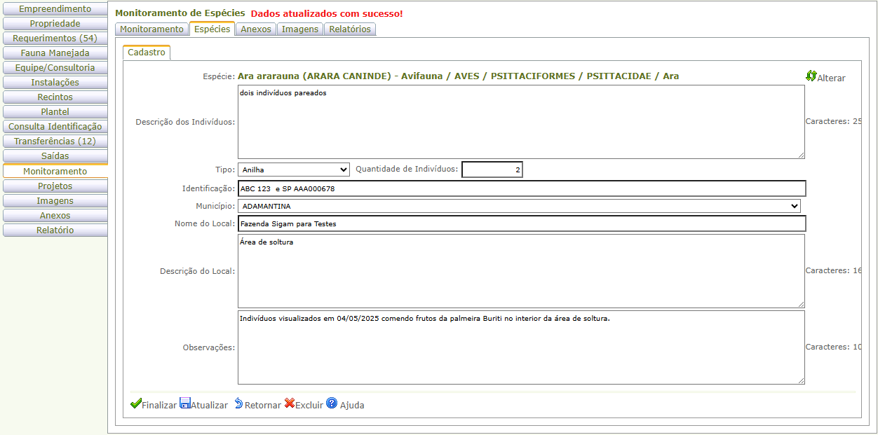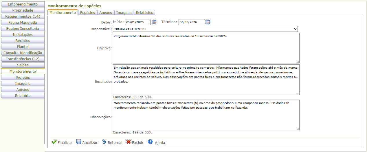 Nota: A aba Monitoramento está disponível apenas aos empreendimentos dos tipos Área de Soltura e Monitoramento de Fauna Silvestre e Programa de Soltura e Monitoramento de Fauna Silvestre.
