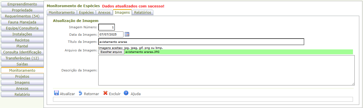 Anexando imagens de espécies do monitoramento cadastrado
