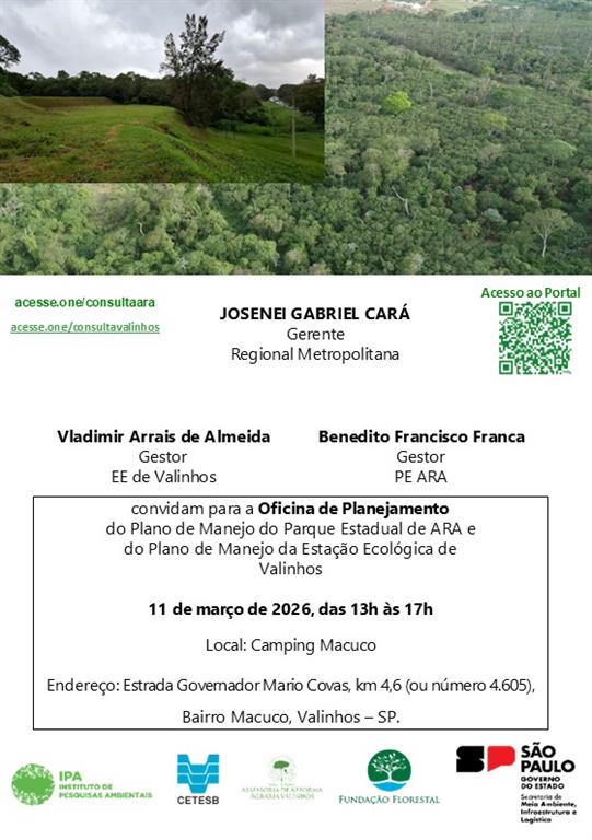 A Fundação Florestal convida Órgãos Ambientais, Entidades Públicas Federais, Estaduais e Municipais, Organizações Não Governamentais, Representantes dos Setores Produtivos e a Comunidade em geral para participarem da Consulta Pública para discussão da proposta de Plano de Manejo da Estação Ecológica de Valinhos.